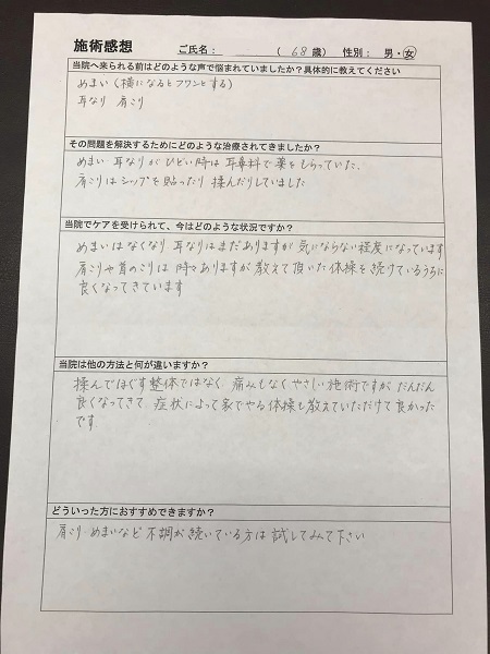 まだ耳の詰まり感と肩こりは残っていますが、初めて施術をしていただいた日から比べるとだいぶ体が戻りつつあります。